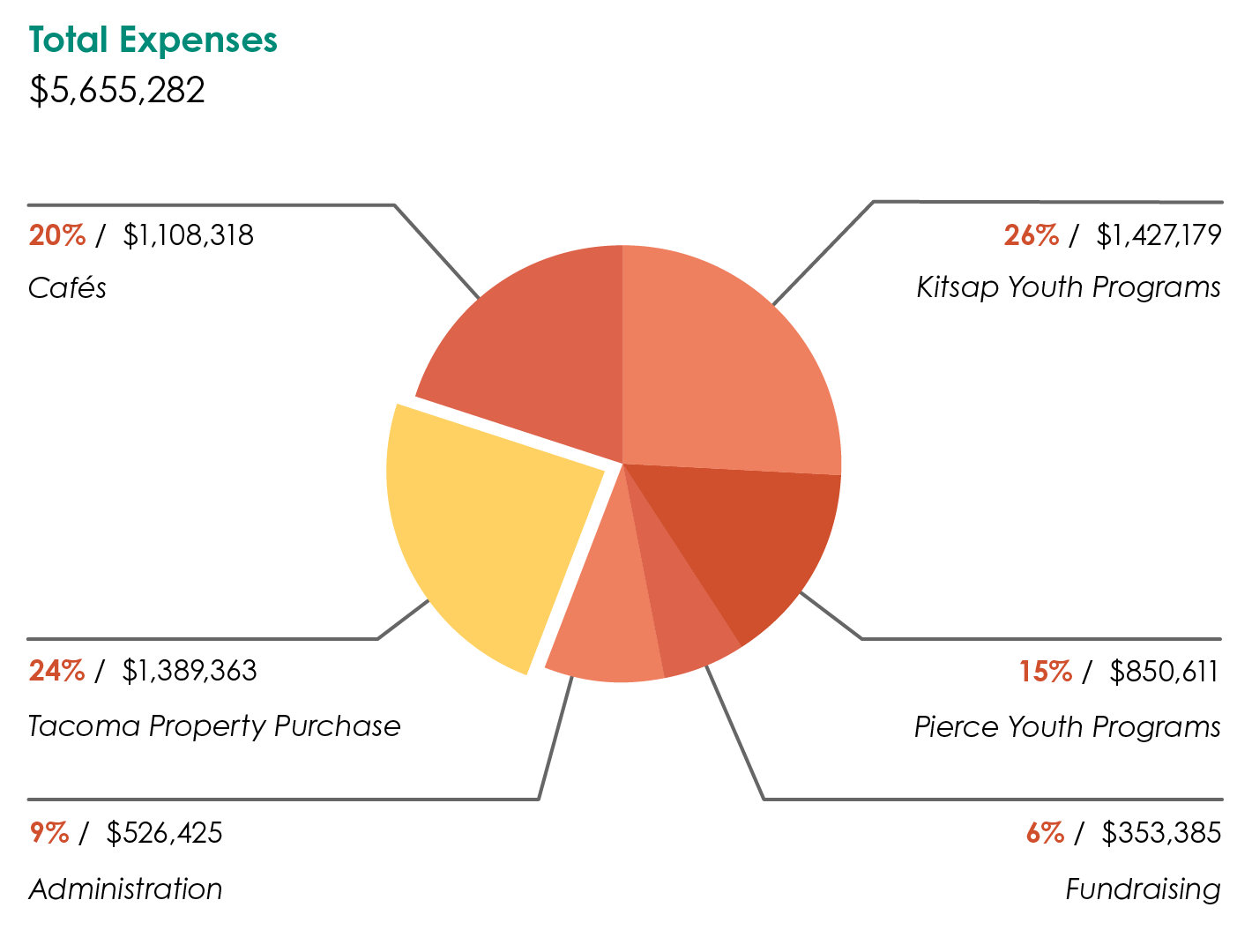 - $1.38 million was spent on the Tacoma property purchase (reflected as an asset on organization’s balance sheet). The Coffee Oasis took a step of faith and finalized the purchase of the Tacoma property. This was made possible by using the program reserves saved over decades of faithful stewardship.
