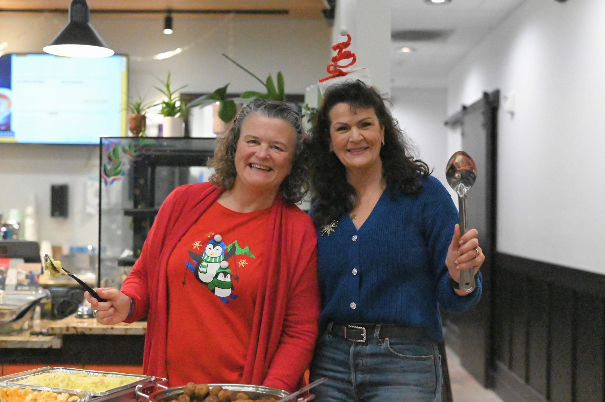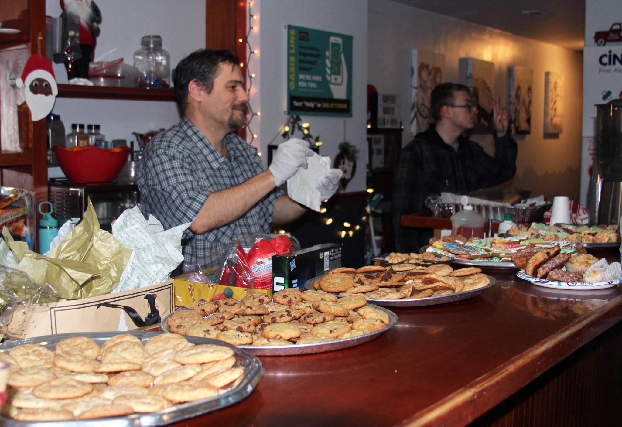 Volunteers and staff arrived early to decorate and set-up tables for a delicious meal of ham, green bean casserole, corn pudding, mashed potatoes, macaroni, apple pies, and Christmas cookies prepared by community members.