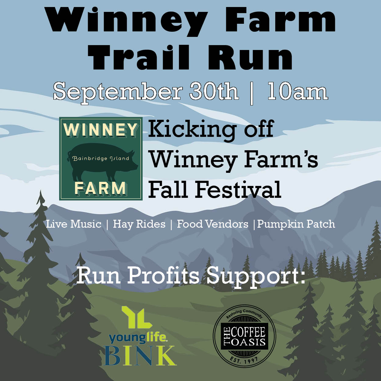 Kick off The Winney Farm Fall Festival with the Winney Farm Trail Run! Run or walk a 5k or 10k to support The Coffee Oasis and Young Life Bainbridge Island North Kitsap. All registration fees up to $2,500 get donated to The Coffee Oasis for this year’s run.