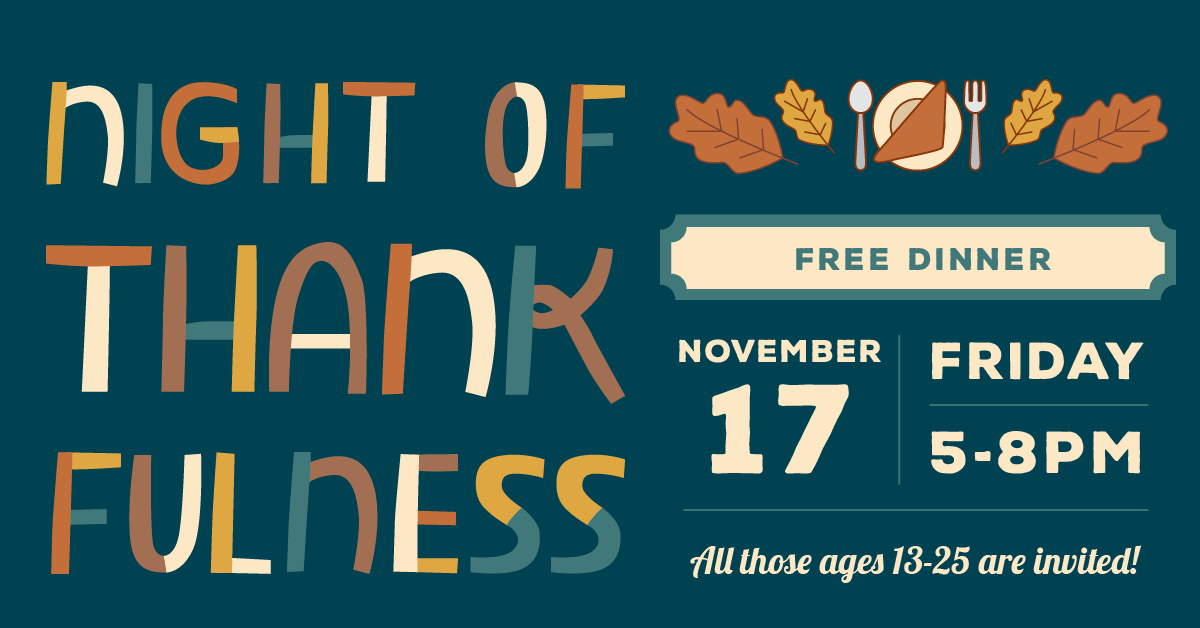Join us for a FREE DINNER (for ages 13-25)! This will include a Thanksgiving meal, decorating cookies, crafts, and a night of thanks.