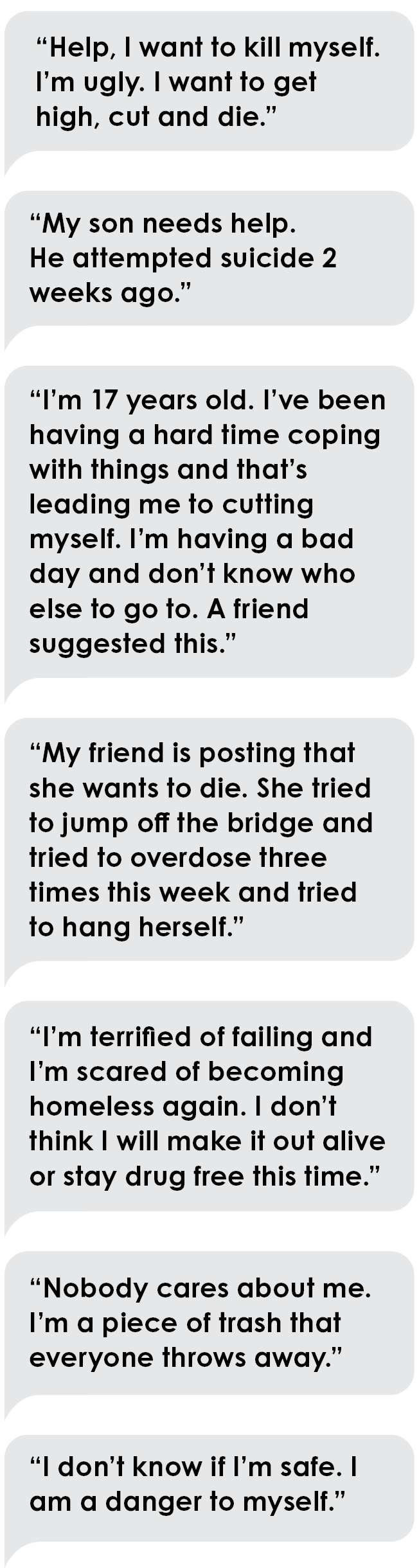 These are a few of the 6,000+ texts we have received in 2021. Since 2018 we have received 22,828 to the crisis text line. These texts do not come from across the country, but from kids in our communities. Kids in our schools. Sometimes, even kids in our own homes.